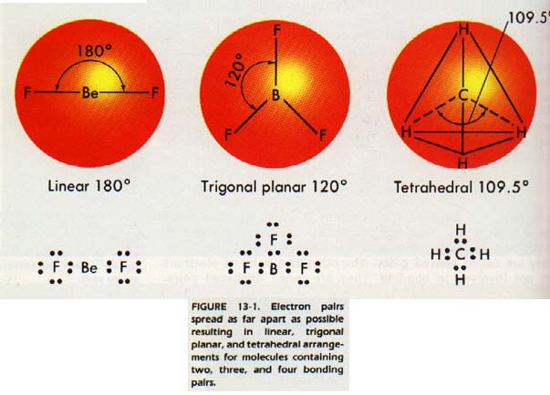 One way of looking at molecules is to consider electron repulsion. Each bond and each unshared pair in the outer level of atom form a charge cloud which repels all other charge clouds. In part, this repulsion is due to all electrons having the same charge.