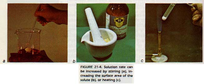 In this way, the solvent which is saturated with solute is moved away from the surface of the solid solute. Fresh solvent can then come into contact with the solid surface. Solution rate is also a function of the kinetic energy of both the solute and solvent particles. The faster the solvent particles are moving, the more rapidly they will circulate among the crystal particles.