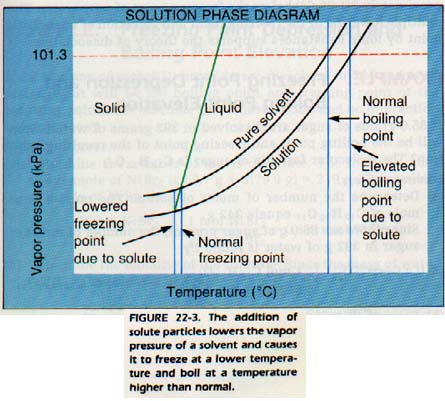 Since the addition of solute particles lowers the vapor pressure, the vapor pressures of the solid and liquid will be equal at a lower temperature. Solutions, then, will freeze at a lower temperature than the pure solvent alone.