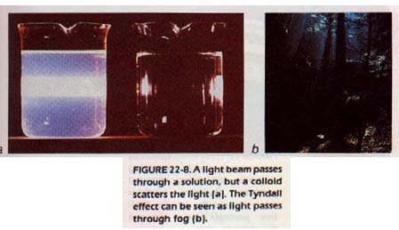 However, if light is passed through a colloid, the light is scattered by the larger, colloidal particles. The beam becomes visible from the side. This effect, called the Tyndall effect.
