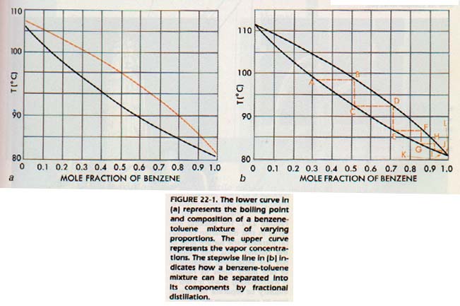 Look at Figure 22-lb. Consider boiling a solution of benzene and toluene in which the mole fraction of benzene is 0.3. It will boil at the temperature represented by point A. The vapor in equilibrium with that solution will have the composition represented by point B which is at the same temperature. It is richer in benzene than the original solution because benzene is more volatile than toluene.