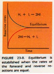 However, as the concentration of HI increases, the reverse reaction, the decomposition of hydrogen iodide, steadily increases. Equilibrium is attained when the rates of the two opposing reactions are equal. The rates of the forward and reverse reactions of the hydrogen iodide reaction are written