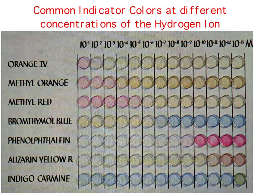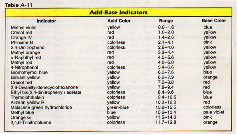 There are times when a pH meter may not be available, or its use may not be convenient. Therefore, sometimes substances called indicators are employed. Indicators are weak organic bases and acids whose colors differ from the colors of their conjugate acids or bases. When indicators are added to a test solution, the color that results is related to the pH of the solution. A number of indicators and their color changes are listed in Table A-ll of the Appendix.