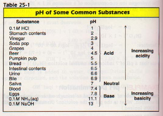 Table 25-1 indicates the pH of several common solutions. Note for those solutions which exist in the body, the maintenance of the pH shown is vital to life.