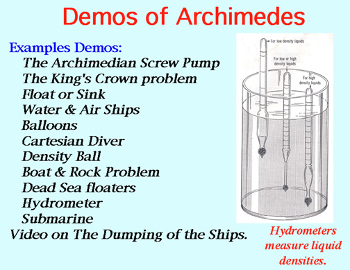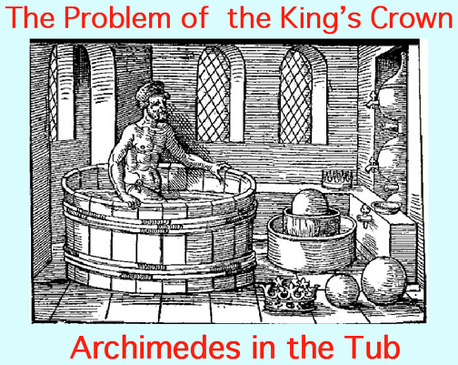 To test the crown, Archimedes weighed it in air and again when suspended under water. The loss of weight in water is called the Buoyant Force and is the weight of the displaced water.