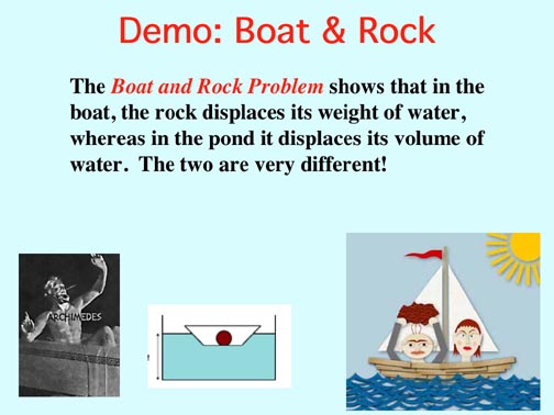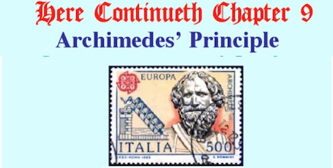 Thus was discovered Archimedes' Principle: An immersed body is buoyed up by a force equal to the weight of the displaced fluid.