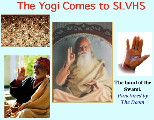 Our student body president was a bus boy at Brookdale Lodge where the "YOGI" was engaged for entertainment. Yogi was from India, wore the turban with a big red jewel, and preformed many astounding fetes. The President asked Yogi if he would put on a show for the kids at a San Lorenzo Valley High School assembly. Yogi consented.