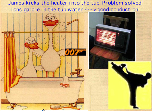 Bathtub electric conductivity and electric heater save our hero from being shot. Video: