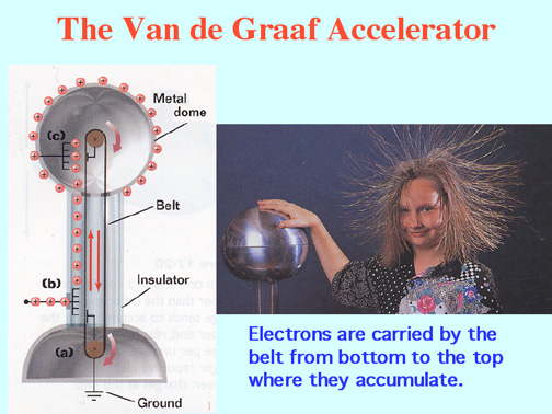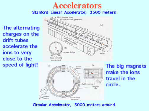 Nuclear Accelerators use high voltages to accelerate charged particles and big magnets to bend the particles. Video: