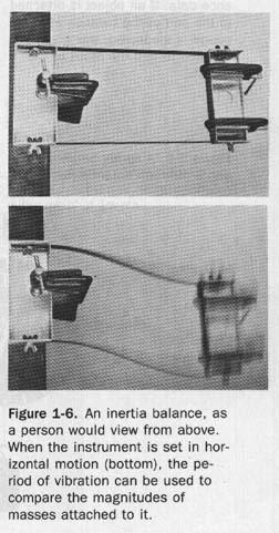 The inertia of matter can be used to measure mass with a device called an inertia balance, shown in Figure 1-6. One end of the balance is clamped to a table. The pan on the other end can be made to vibrate horizontally. The number of times this device vibrates in a second of time depends upon the length and stiffness of the two supporting metal blades and upon the total mass of the pan and any objects fastened to it. Since the blades vibrate horizontally the action of the inertia balance is entirely independent of gravity, which acts vertically. The more massive the pan and its contents, the slower will be the changes in their motion and the longer will be the time they will take to go through a complete vibration. The time required for a single vibration is called the period.