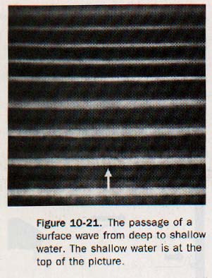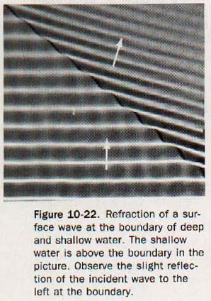 In Figure 10-21 the deep water representing the medium of higher propagating speed is in the lower portion of the photograph. The wave moves toward the shallow water in the upper portion. The boundary between the deep and shallow water is parallel to the advancing wave front. Thus each incident wave crest approaches the shallow region along the normal to the boundary.