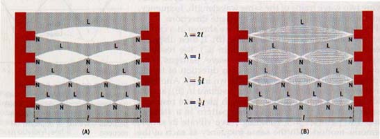 1. Figure 10-30(A) illustrates a time-exposure view showing the envelopes of the standing waves. Part (B) is a strobe-flash view showing positions of the strings at different instants of time. In a standing wave, particles of the string at the nodes are continuously at rest.