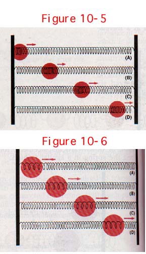 In this manner the crest travels along the spring as shown in Figure 10-4(D) and (E). A trough, or downward displacement, formed at 2 travels along the spring in a similar fashion.