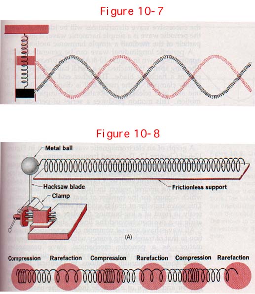 A periodic longitudinal wave can be generated by apparatus shown in Figure 10-8(A) above. The long spring is attached to a metal ball fastened to end of a hacksaw blade. The other end of the blade is rigidly clamped. If the metal ball is displaced slightly one side and released, it vibrates with simple harmonic motion.