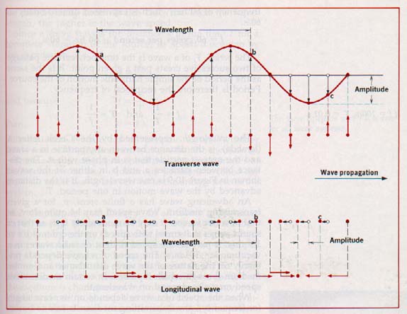 Similarly, a continuous wave disturbance of this type gives rise to longitudinal wave motion. Energy is transferred from particle to particle along the medium without motion of the medium as a whole. A longitudinal wave is one in which the displacement of particles of the medium is parallel to the direction of propagation of the wave.