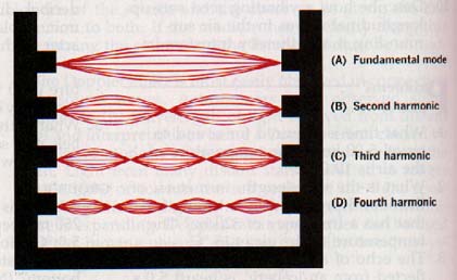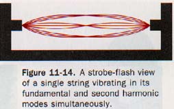 When a string is plucked or bowed, not only the fundamental mode but other, higher modes of vibration may be present. Suppose a string vibrates in two segments with a node in the middle, as in Figure Il-11(B).