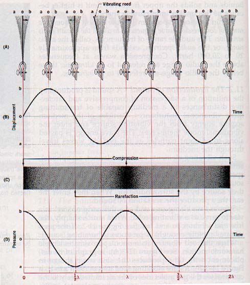 The combined effect of this simultaneous compression and rarefaction transfers energy to the left, again in the direction of the compression. If we consider just the series of compressions and rarefactions produced to the right, it is apparent that the maximum compression occurs as the reed moves through its equilibrium position o traveling from a to b. See Figure 11-3(C).
