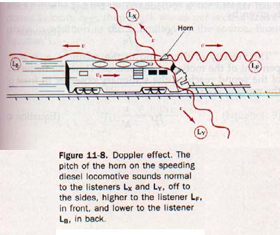 The change in pitch produced by the relative motion of the source and observer is known as the Doppler Effect. Of course, the frequency of the sound emitted by the source remains unchanged as does the velocity of the sound in the transmitting medium. Figure 11-8 illustrates this principle.