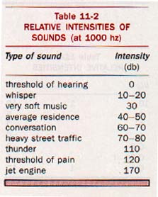 When expressing the intensity of a sound, it is often compared with the intensity of the threshold of hearing and this ratio of intensities yields an expression of the relative intensity of the sound. Because of the great range of intensities over which the ear is sensitive, a logarithmic rather than an arithmetic intensity scale is used. The unit of relative intensity is the decibel (db). Here are some common examples: