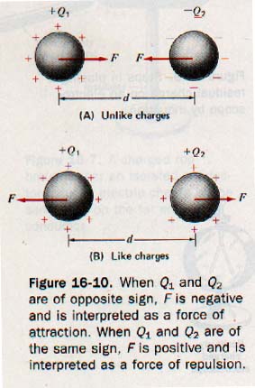In Figure 16-10(A) (above) the charges Q1 and Q2 have opposite signs and the force F acts on each charge to move it toward the other. In Figure 16-10(B) (above), charges Q1 and Q2 have the same sign and the force F acts on each charge to move it away from the other. The force between the two charges is a vector quantity that acts on each charge.