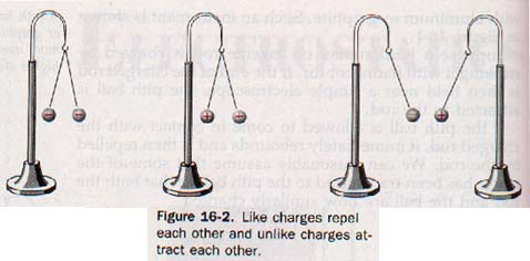 Two pith balls that are negatively charged by contact with a charged rubber rod repel each other. Similarly, two pith balls that are positively charged by contact with a charged glass rod also repel each other. However, if a negatively charged pith ball is brought near a positively charged pith ball, they attract each other. See Figure 16-2. These observations are summarized in a basic law of electrostatics: