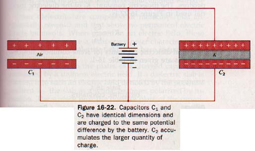 Except for the material separating the plates, the two capacitors are identical and have the same potential difference across their plates. The factor K by which the charge on C2 exceeds the charge on C1 must be due to a property of the insulating material of C2. The ratio Q2/V is larger than Q1/V by this factor K.