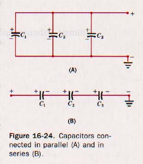 Now suppose we connect the three capacitors in series, as shown in Figure 16-24(B) above. A positive charge placed on C1 from the + source induces a negative charge on the second plate as the electrons are attracted way from the plate C2, which is connected to C1. A positive charge of the same magnitude is left on the + plate of C2. Similarly the plates of C3 acquire the same magnitude of charge. Thus
