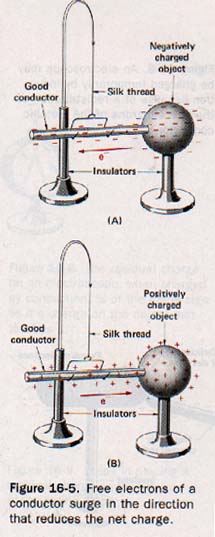 If the charged object has an excess of electrons (negatively charged), the surge is away from the object. See Figure 16-5. In either case a transfer of electric charge continues until the repulsive forces between the free electrons are in equilibrium throughout the entire system.