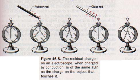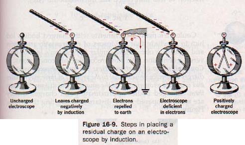 16.7 Residual Charge by Induction When a charged rubber rod is held near the knob of an electroscope, there is no transfer of electrons between the rod and the electroscope. If a path is provided for electrons to be repelled from the electroscope while the repelling force is present, free electrons escape. Then if the escape path is removed before removing the repelling force, the electroscope is left with a deficiency of electrons, giving it a residual positive charge.