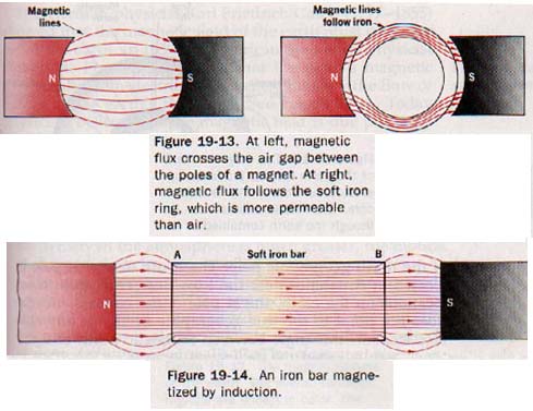 If a sheet of iron covers a magnet, there is little magnetic field above the sheet. The flux enters the iron and follows a path within the iron itself. Similarly, an iron ring placed between the poles bf a magnet provides a better path than air for the magnetic flux. This effect is illustrated in Figure 19-13. The flux density in iron is greater than it is in air; therefore, iron is said to have a high permeability. The permeabilities of other ferromagnetic substances are also very high.