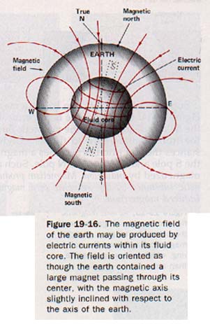19.6 Terrestrial Magnetism Suppose the earth contained a great bar magnet. See Figure 19-16. It would produce a magnetic field similar to its actual field. Over most of the earth's populated surface the north-seeking pole of a compass points northward. Although it is the south pole of our fictitious magnet that attracts the N pole of the compass, the pole region is conventionally called the north magnetic pole because it is located in the northern hemisphere. Similarly, the pole region in the southern hemisphere is called the south magnetic pole.