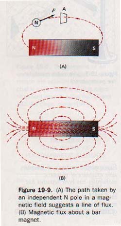 The path of an independent N pole in a magnetic field suggests a line of flux. A line of flux is a line so drawn that a tangent to it at any point indicates the direction of the magnetic field. Flux lines are assumed to emerge from a magnet at the N pole and to enter the magnet at the S pole. Every flux line is a closed path running from S pole to N pole within the magnet. See Figure 19-9.