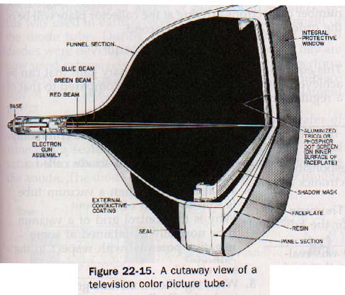 The Television Tube uses electromagnets to deflect the electron beams. Three beams actuate the three primary colors of phosphors on the screen.