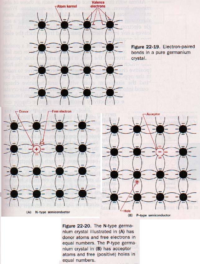 P- and N-type semiconductors are formed by doping with trace quantities of acceptor and donor atoms respectively. N-type semiconductors are electron-rich materials. The free electrons are the negative charge carriers. P-type semiconductors are hole-rich materials. The holes act as positive charge carriers.