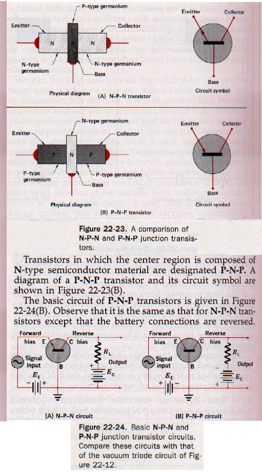 Junction transistors consist of two P-N junctions back to back with thin P or N regions in between. They are designated N-P-N and P-N-P. Transistor elements correspond functionally to the elements of a vacuum triode.