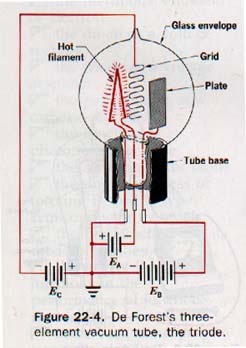 The Triode has a control grid between the cathode and the anode (plate). Varying the charge in the grid, controls the current flow through the tube.