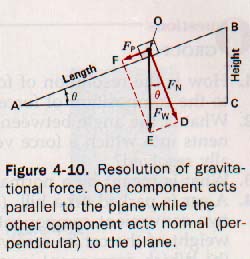 The vector FN represents the force exerted by the object perpendicular to the incline or the amount of the object's weight supported by the incline. The vector Fp represents the component that tends to move the object down the incline. (The plane is assumed to be frictionless.) See Figure 4-10.