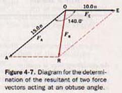 The angle between two forces acting on the same point is often not a right angle. Figure 4-6 represents the vectors for the two forces 10.0 n east and 15.0 n 40.0o east of south acting on point O. The parallelogram is completed as shown. Observe that the diagonal vector representing the resultant is drawn from the point on which the two original forces are acting since the resultant will also act on this point. The magnitude of FR is found graphically to be 23 n. The direction is 30o south of east.