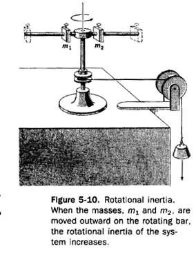 In Figure 5-10 two masses, ml and m2, are mounted on a bar that is fastened to an axle. The masses can be placed on the bar at varying distances from the axle. If a cord is wound around the axle and attached to a weight that falls under the influence of gravity, a constant torque is applied to the axle.
