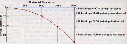 Immediately after it leaves the muzzle of the gun, the force of gravity begins to accelerate the bullet toward the earth's center of gravity. This force is vertical. During the first second, a freely falling body drops 4.90 m. The bullet drops 4.9O m while traveling the first 1250 m horizontally. See Figure 5-2. In two seconds the bullet travels 2500 m horizontally, at which time it also drops vertically through a distance of 19.6 m.