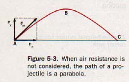 When the rifle is aimed, its muzzle is directed upward at the predetermined angle. When the gun is fired, this angle gives the bullet the upward velocity component necessary to compensate for the bullet's drop on its way to the distant target. The path a projectile takes if it is fired at an upward angle is shown in Figure 5-3. The path of the projectile, ABC, is called the trajectory.